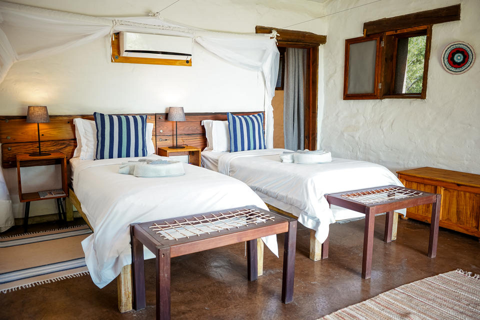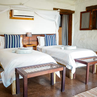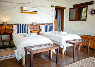 Das Camp verfügt über 2 Familienchalets vor Ort, jedes mit 2 Zweibett- oder Doppelzimmern und einer miteinander verbundenen Lounge.. Jedes Zimmer verfügt über ein eigenes Bad mit Innen- und Außenduschen, Klimaanlage und Deckenventilator, Safe und eigener Veranda. Ein zusätzliches drittes Bett kann auf Anfrage hinzugefügt werden. Die gesamte Lodge wurde so konzipiert, dass sie den spektakulären Blick über den Chobe-Fluss optimal nutzt. Egal, ob Sie sich auf Ihrer privaten Veranda entspannen, ein Buch in der Lounge lesen, einen Drink an der Bar genießen oder sich im Pool abkühlen, die Aussicht ist immer zum Genießen da.