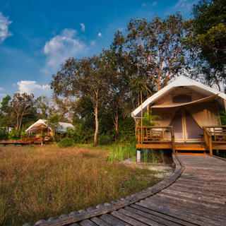 Das Camp hat neun komfortable und geräumige Zelte im Safari-Stil. Jedes der Zelte bietet seinen Gästen einen komplett geschlossenen und mückengeschützten, etwa 30m² großen, Innenraum. Die Annehmlichkeiten im Zelt entsprechen etwa einem 3*-Standard einschließlich zweier Betten oder einem Doppelbett, ausreichend Ventilatoren, Bambus- und Rattan-Möbeln, einem Badezimmer mit heißem Wasser, Regendusch und einer großen Terrasse mit Liegestühlen. Das offene Restaurant bietet Platz für 18 Gäste auf einer erhöhten Plattform mit Blick auf den idyllischen, langsam fließenden Preak Tachan. Der Khmer-Chefkoch bietet Ihnen eine Auswahl an köstlichen Khmer- und eine Auswahl an internationalen Gerichten. Vegetarische Kost ist selbstverständlich auf Anfrage erhältlich. Kajaktouren durch die Flusslandschaft mit einem Guide sind das Highlight. Auf Wanderungen durch den dichten Dschungel werden die Pflanzen- und Tierwelt erklärt. Nach der Rückkehr ist ein Bad im klaren und erfrischenden Fluss eine Wohltat. Am Abend wartet eine zauberhafte, mit Schilf überdachte Terrasse zum Sundowner auf Sie. Freuen Sie sich auf eine gelungene Mischung aus Komfort, Abenteuer und Bewegung in der Natur.