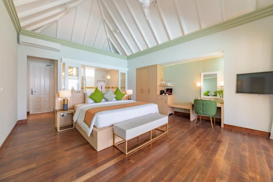 Die Standardunterkünfte sind alles andere als Standard. Die Türen führen auf eine geräumige Strandterrasse oder einen Panorama-Balkon. Das warme Wasser der Lagune ist nur wenige Schritte entfernt. Im Inneren führt ein großzügig geschnittenes Schlafzimmer mit Kingsize-Bett zu einem Badezimmer mit ebenerdiger Dusche und Ankleideraum.