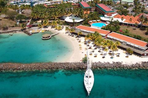Blick auf eine Bar im Wasser in Martinique, umgeben von Palmen und Segelbooten.
