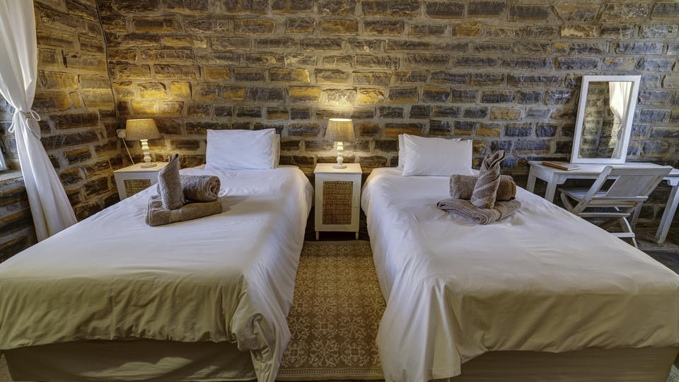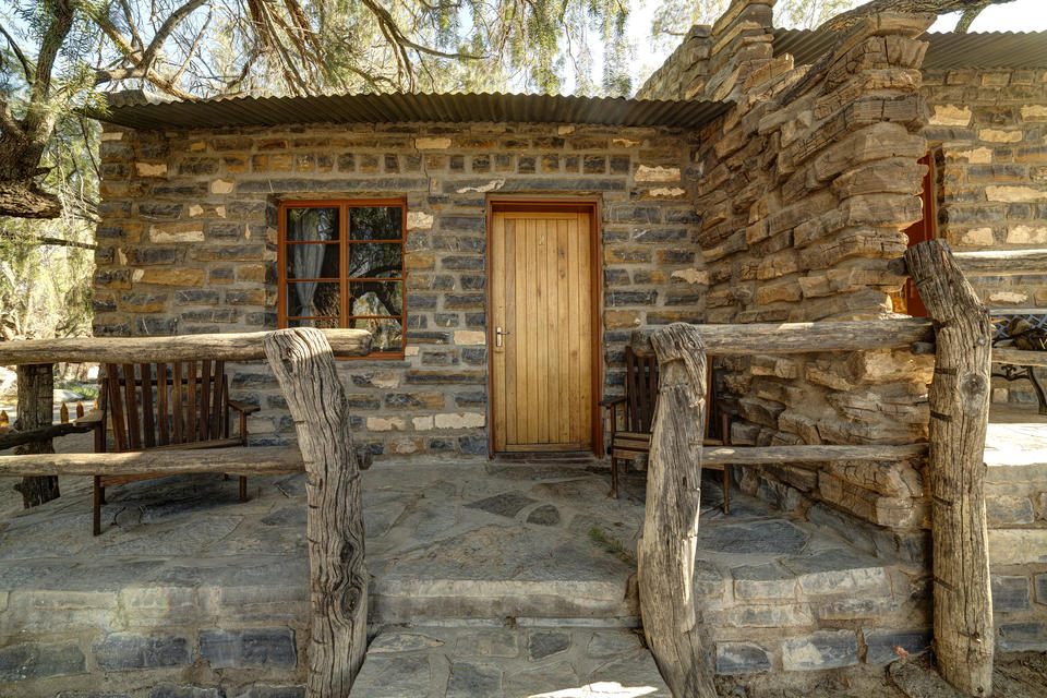 Wir bieten auch 6 aus Stein gebaute rustikale Chalets, jedes mit eigener Veranda und eigenem Bad. Alle unsere rustikalen Unterkünfte bieten Platz für 2 Personen und sind mit einem eigenen Bad mit Dusche, Ventilator, Doppelgarderobe und Schreibtisch ausgestattet.