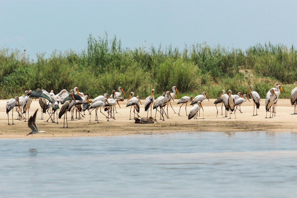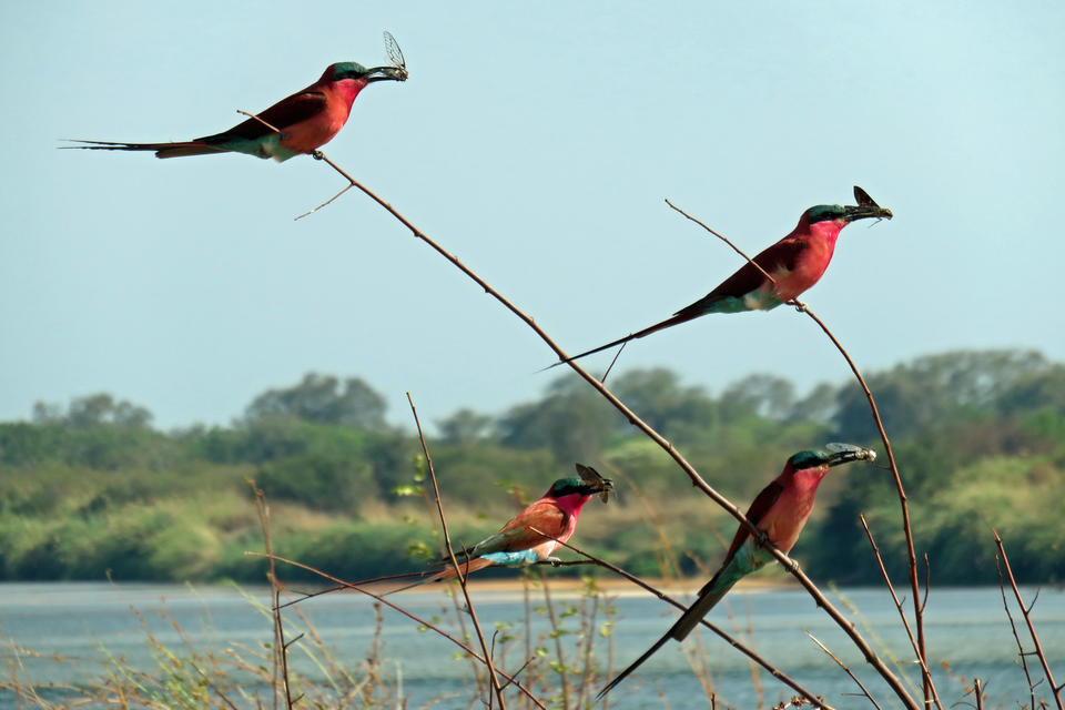 Am Ufer des mächtigen Sambesi liegt die Zambezi Mubala Lodge. Diese Lodge ist der Traum eines jeden Vogelliebhabers und beherbergt eine der größten Kolonien von Karminbienenfressern. Zu den Vögeln gesellen sich gern Nilpferd und Krokodil, die sich in den flachen Gewässern entlang des Ufers sonnen.