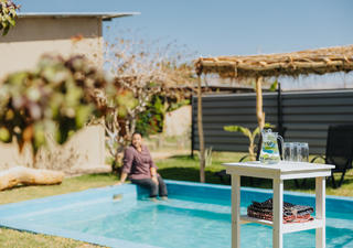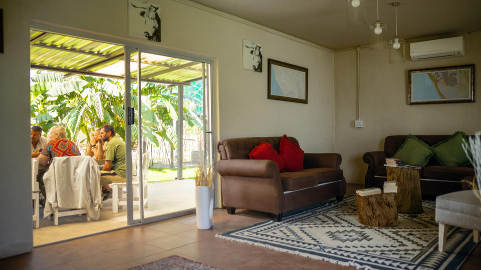 Im Restaurant werde Frühstück, Mittag- und Abendessen serviert. Dafür werden hauptsächlich lokale Zutaten verwendet, von Bananen über Kürbisse, Tomaten, Salate, Zwiebeln, Karotten und mehr. Freuen Sie sich auf hauseigenes Brot und das beste Bananenbrot nördlich von Windhoek.