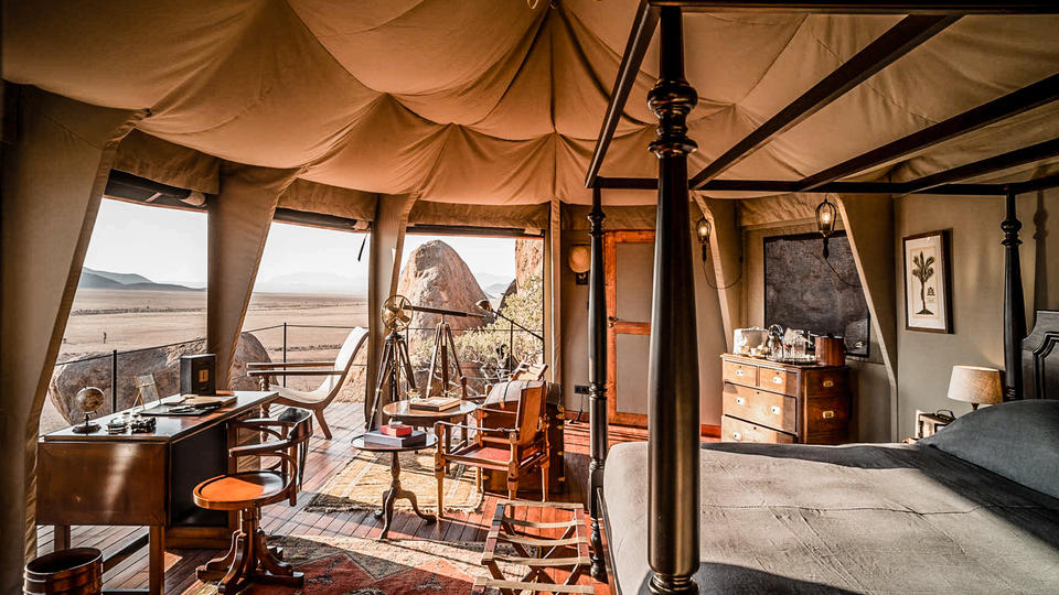 Die 10 geräumigen Zelte, die auf Felsen errichtet wurden, bieten eine einzigartige Reise durch die Zeit. Sie sind reich mit Antiquitäten aus edlen Materialien, bunten Teppichen und edlem Holz eingerichtet und lassen das Leben der wohlhabenden Entdecker der Vergangenheit wieder auferstehen. Eine Exklusivität, die mit der Einfachheit der endlosen Umgebung kontrastiert. Bei Sonop ist alles auf den Reichtum der Wüste ausgerichtet: Beeindruckende Aussichten und vielfältige Abenteuer ermöglichen es den Gästen, die wahre Schönheit der Wüste zu bewundern. Jeden Abend werden die Gäste zu einem opulenten gastronomischen Erlebnis mit funkelndem Besteck und Kerzenleuchtern und Bewirtung mit schwarzen Krawatten und weißen Handschuhen geladen. Ausgezeichneter Service und Liebe zum Detail zeichnen alle Einrichtungen dieses Camps aus.