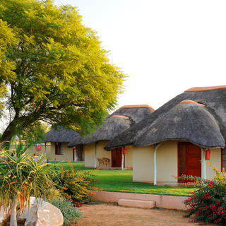 Die Frans Indongo Lodge strahlt das Lebensgefühl der Menschen im Norden Namibias auf sehr charmante Weise aus. Der Komplex ist nach dem Vorbild der traditionellen Ovambo Homesteads: Palisaden aus hohen Spitzpfählen umgeben die Lodge und vermitteln ein Gefühl der Wärme und Sicherheit des Hauses mitten im afrikanischen Busch. Im Inneren des Komplexes trennt eine Palisade den Restaurant- und Poolbereich von den Gästehäusern und sorgt so für mehr Privatsphäre. Für die Häuser wurden verschiedene schöne Baustoffe wie Naturstein, Holz und Schilf verwendet. Alltagsgegenstände in Ovambo - irdische Töpfe, voluminöse Aufbewahrungskörbe oder originelle Holzfiguren - dienen als Dekoration, um das afrikanische Thema zu betonen und verleihen der Lodge einen ganz besonderen Charme.