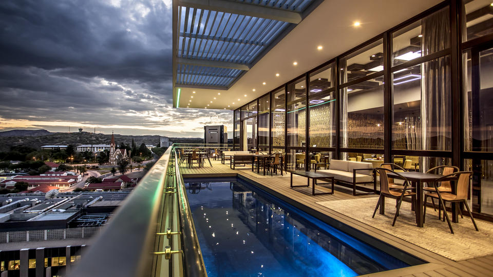 Der Poolbereich auf dem Dach, der rund um die Uhr für Hotelgäste geöffnet ist, ist die perfekte Umgebung, um nach einem Tag voller Aktivitäten in Namibia zu entspannen. Die Gäste können den Panoramablick auf die pulsierende Hauptstadt genießen und dabei einen leichten Snack und einige Getränke genießen.