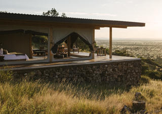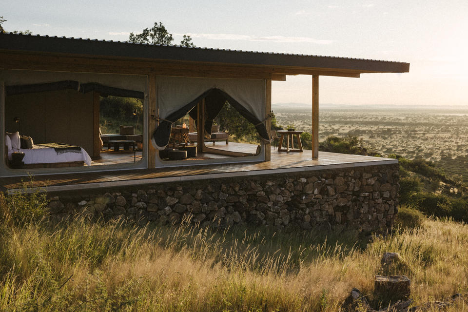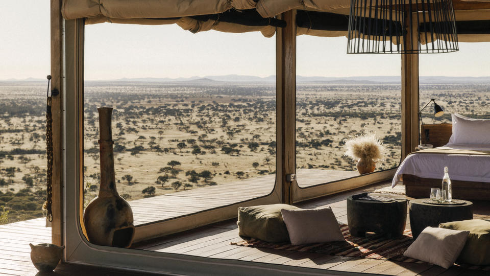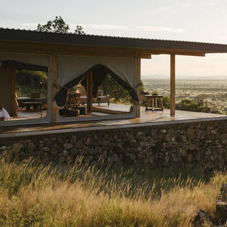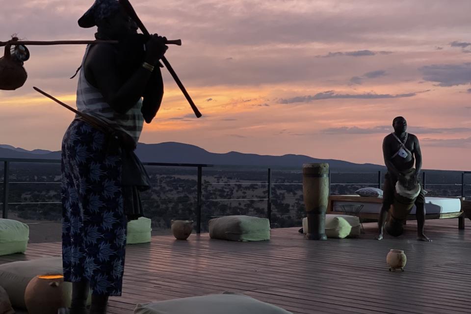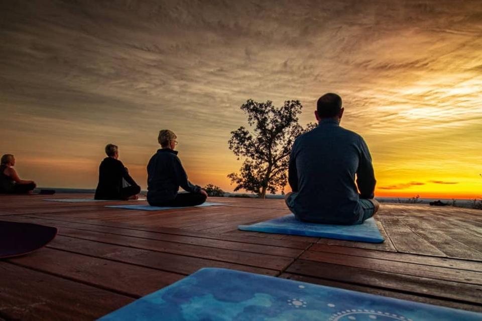 Yoga mit Blick auf die weiten Savannenlandschaften.