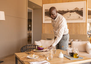 Acht große Zelte mit eigenem Bad (darunter ein Familienzelt) und der Gemeinschaftsbereich bieten schattige Aussichtspunkte, während Ausflüge in die Umgebung eine Fülle an Tierarten zeigen, die sich an das Leben in der Wüste angepasst haben, sogar Löwen und Schabrackenhyänen können Sie in dieser weiten, aber nicht leblosen Landschaft erblicken.