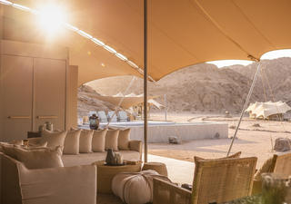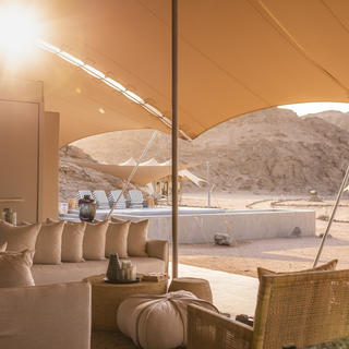Eine stilvolle Familieneinheit besteht aus zwei Schlafzimmern mit jeweils zwei Dreiviertelbetten und eigenem Bad. Separate Eingänge führen zu jedem Schlafzimmer. Eine geräumige Gemeinschaftsterrasse bietet schattige Sitzgelegenheiten zum Entspannen und Genießen der spektakulären Aussicht auf die umliegende Wüste bei einem Sonnenuntergang.