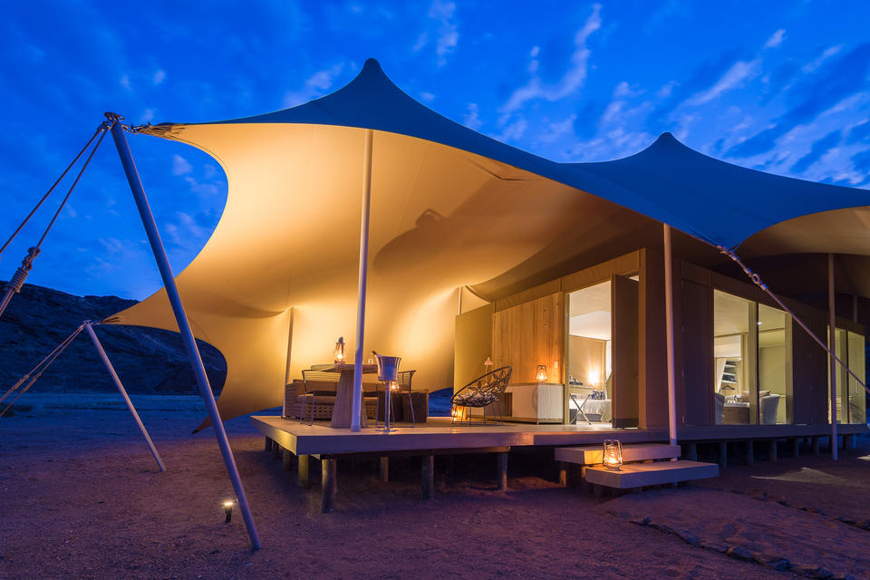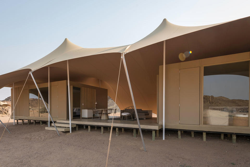 Das Camp besteht aus acht gut isolierten Zelten mit frei fließendem Stretch-Leinwanddach und schwebendem Betonfundament auf Stelzen - mit eigenem Bad. Sandwege verbinden alle Zelte mit dem Hauptbereich.