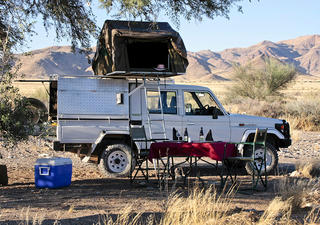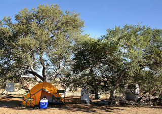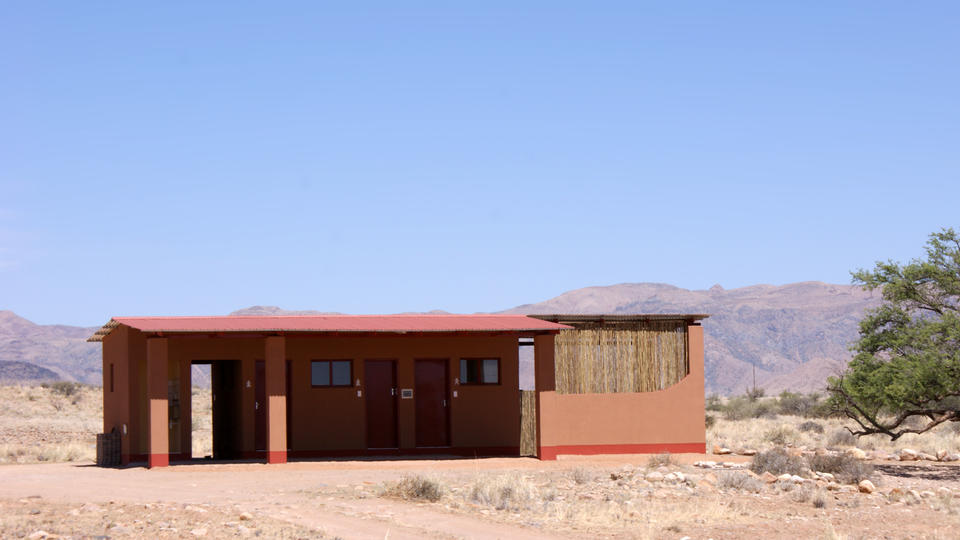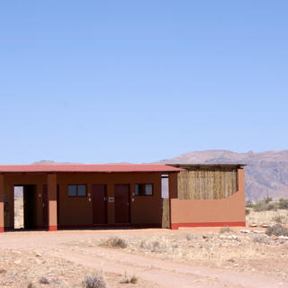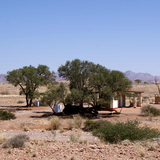 Die Stellplätze liegen an einem Trockenfluss unter schattenspendenden Akazien mit Blick auf die versteinerten Dünen der Ur-Namib. Stromanschluss, Grillplätze und sanitäre Anlagen sind vorhanden. Frühstück ist nicht in den Preis eingeschlossen.