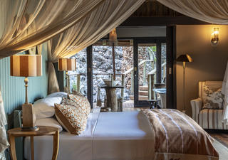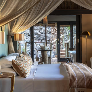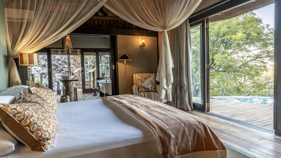 Dieses persönliche Camp verfügt über nur 3 geräumige Suiten mit eigenem Plunge Pool, Bad, Sala und Außendusche. Der Wohn- und Essbereich bietet einen herrlichen Blick auf ein Wasserloch unterhalb des Lagers, die offene Terrasse ermöglicht entspanntes, stilvolles Essen unter dem afrikanischen Himmel. Bei gemeinsamen Pirschfahrten mit einem engagierten Guide erleben Sie ein einmaliges Naturerlebnis in einem der großartigsten Safariziele Afrikas. In diesem Naturschutzgebiet können Sie exklusiv Tag und Nacht zu Tierbeobachtungsfahrten aufbrechen, Tiere an Wasserlöchern beobachten, zu Fuß auf Pirsch gehen und sich gemeinsam mit einem erfahrenen Guide Breitmaulnashörnern nähern. Pirschfahrten und Tagesausflüge in den nahe gelegenen Etosha Nationalpark werden ebenfalls angeboten.