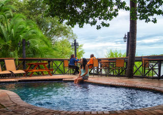 Das Deck, die Bar und das Restaurant blicken auf die Gischt der Victoriafälle und bieten traumhafte Sonnenuntergänge am Sambesi-Fluss.