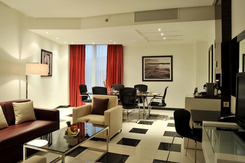 Mit einem eleganten, modernen Design sind die großzügigen 70 qm großen Suiten in zwei Bereiche unterteilt: ein großes Wohnzimmer mit einer gemütlichen Lounge und einem beeindruckenden Essbereich, ausgestattet mit einem großen Tisch für Mahlzeiten und Tagungen, und der herrliche Schlafbereich. Die Suiten verfügen über zwei Minibar, zwei 43-Zoll-TVs, ein großes Badezimmer mit Duschkabine und Jacuzzi, eine moderne Nespresso-Kaffeemaschine, üppige Bademäntel, weiche Hausschuhe und ein Bügeleisen/-brett.