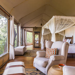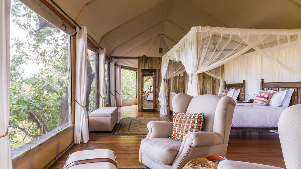 Die Unterkunft besteht aus 4 traditionellen Safarizelten, etwa 500 m² groß, auf einem erhöhten Holzdeck. Die Zelte sind großzügig verteilt, so dass , das Wild frei im Camp rumlaufen kann.
