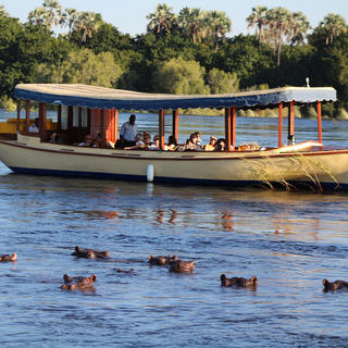 Erleben Sie die historische Reise von David Livingstone, die an Bord der Ra-Ikane-Flotte den mächtigen Sambesi-Fluss erforscht. Benannt nach seinem Anführer, stellen die Boote die Schönheit einer vergangenen Epoche dar, die die reiche Geschichte der Victoriafälle und ihrer Entdecker, Abenteurer und Helden würdigt. Das Ra-Ikane bietet eine Vielzahl von Kreuzfahrten, zum Frühstück, Mittag- und Sonnenuntergang, sowie private Charter.