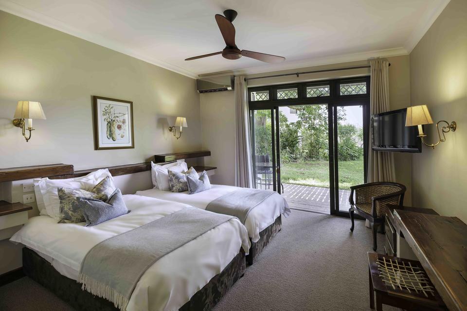 Die Zimmer sind geräumig und mit Eisenbahn-Teakholzmöbeln eingerichtet. Alle Zimmer blicken auf die mächtigen Victoriafälle und den Sambesi-Nationalpark, sodass Sie oft Wildtiere auf den Rasenflächen des Hotels grasen sehen — während Sie bequem auf Ihrer privaten Terrasse sitzen.