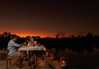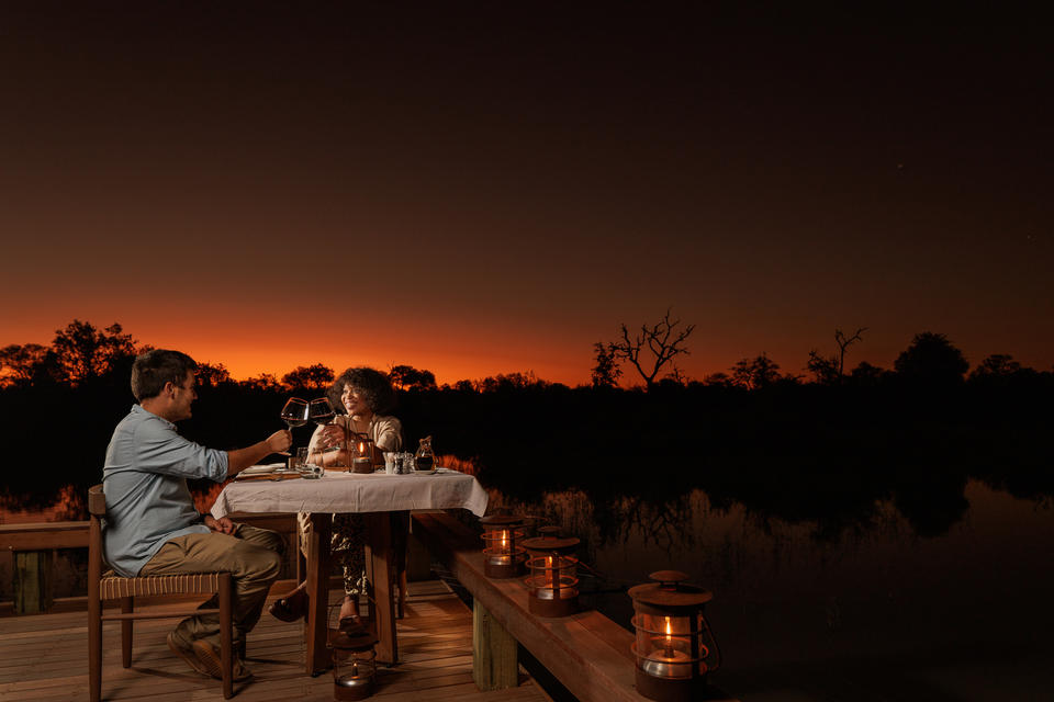 Mehrmals pro Woche ist das Abendessen im Camp eine herzhaftere Mahlzeit am Lagerfeuer, die unter dem Sternenhimmel in einem „Boma“ serviert wird, einem runden Gehege, das ursprünglich aus Zweigen besteht. Das gemütliche, von Laternen beleuchtete Ambiente erinnert an die Anfänge der Safari-Pioniere.